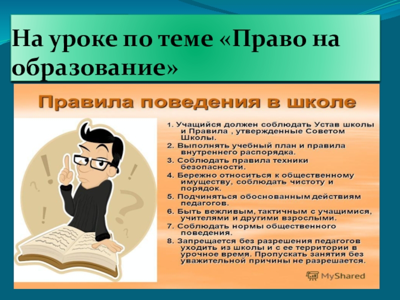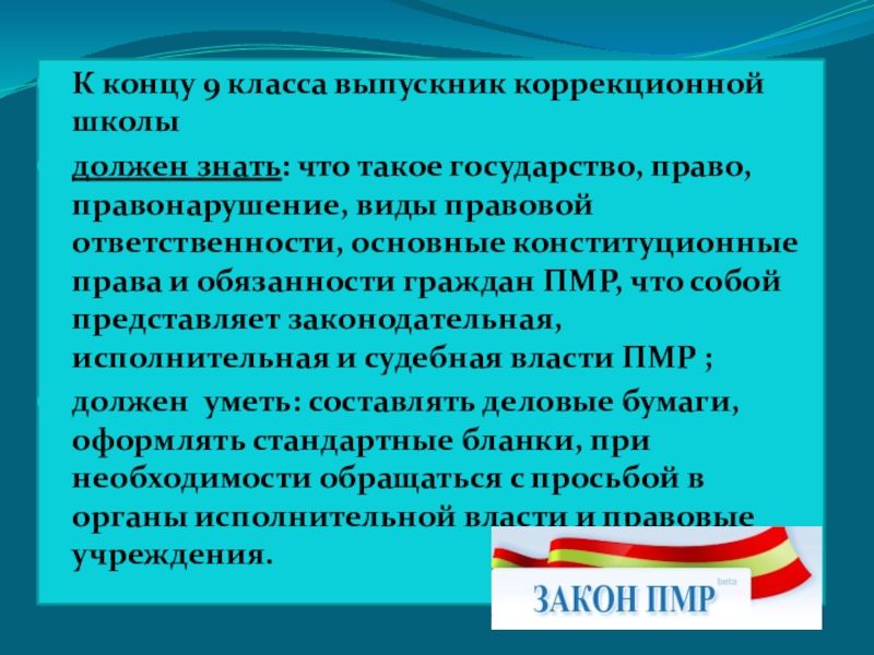 жизни в обществе и производительному труду. На реализацию этой цели всегда было направлено изучение вопросов права на доступном уровне для учеников с нарушением интеллекта.
