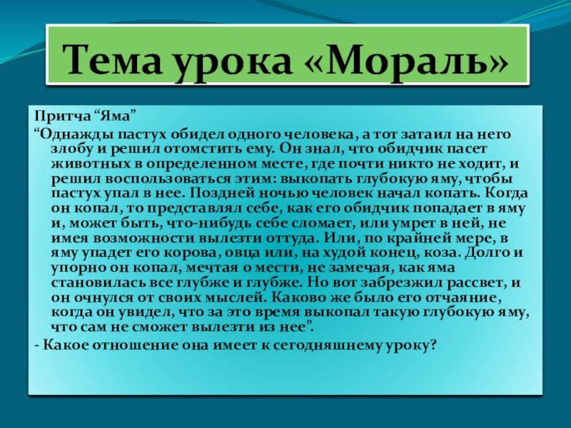 на него злобу и решил отомстить ему. Он знал, что обидчик пасет животных в определенном месте, где почти никто не ходит, и решил воспользоваться этим: выкопать глубокую яму, чтобы пастух упал в нее. Поздней ночью человек начал копать. Когда он копал, то представлял себе, как его обидчик попадает в яму и, может быть, что-нибудь себе сломает, или умрет в ней, не имея возможности вылезти оттуда. Или, по крайней мере, в яму упадет его корова, овца или, на худой конец, коза. Долго и упорно он копал, мечтая о мести, не замечая, как яма становилась все глубже и глубже. Но вот забрезжил рассвет, и он очнулся от своих мыслей. Каково же было его отчаяние, когда он увидел, что за это время выкопал такую глубокую яму, что сам не сможет вылезти из нее”.