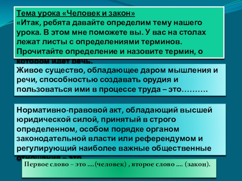 Первое слово – это ….(человек) , второе слово …. (закон).