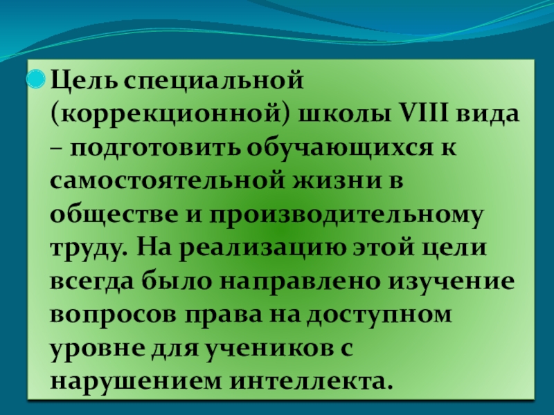 Слайд 2Цель специальной (коррекционной) школы VIII вида – подготовить обучающихся к самостоятельной