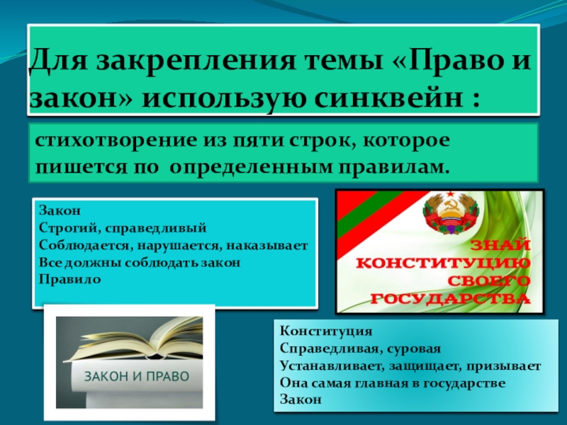 Слайд 9Для закрепления темы «Право и закон» использую синквейн :