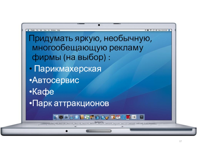 Слайд 17Придумать яркую, необычную, многообещающую рекламу фирмы (на выбор) :
