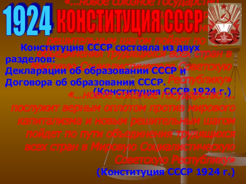 «…новое союзное государство ... послужит верным оплотом против мирового капитализма и новым решительным шагом пойдет по пути объединения трудящихся всех стран в Мировую Социалистическую Советскую Республику» (Конституция СССР 1924 г.)