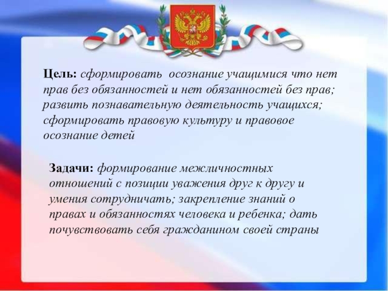 Задачи: формирование межличностных отношений с позиции уважения друг к другу и умения сотрудничать; закрепление знаний о правах и обязанностях человека и ребенка; дать почувствовать себя гражданином своей страны