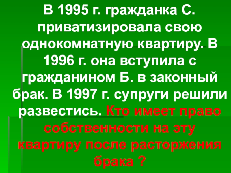 Слайд 12 В 1995 г. гражданка С. приватизировала свою однокомнатную квартиру. В