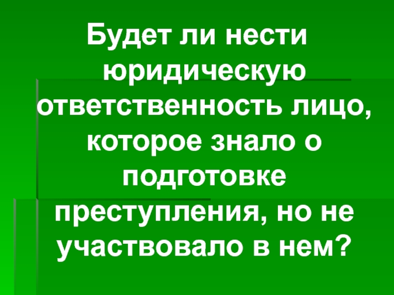 Слайд 17Будет ли нести юридическую ответственность лицо, которое знало о подготовке преступления,