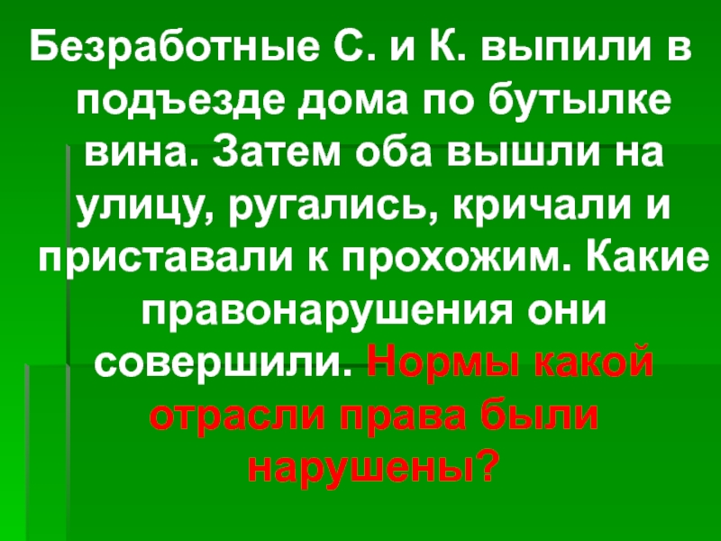 Слайд 13Безработные С. и К. выпили в подъезде дома по бутылке вина.