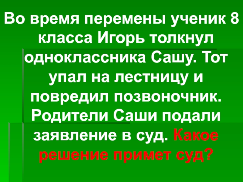 Слайд 19Во время перемены ученик 8 класса Игорь толкнул одноклассника Сашу. Тот