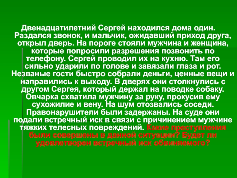 друга, открыл дверь. На пороге стояли мужчина и женщина, которые попросили разрешения позвонить по телефону. Сергей проводил их на кухню. Там его сильно ударили по голове и завязали глаза и рот. Незваные гости быстро собрали деньги, ценные вещи и направились к выходу. В дверях они столкнулись с другом Сергея, который держал на поводке собаку. Овчарка схватила мужчину за руку, прокусив ему сухожилие и вену. На шум отозвались соседи. Правонарушители были задержаны. На суде они подали встречный иск в связи с причинением мужчине тяжких телесных повреждений. Какие преступления были совершены в данной ситуации? Будет ли удовлетворен встречный иск обвиняемого?