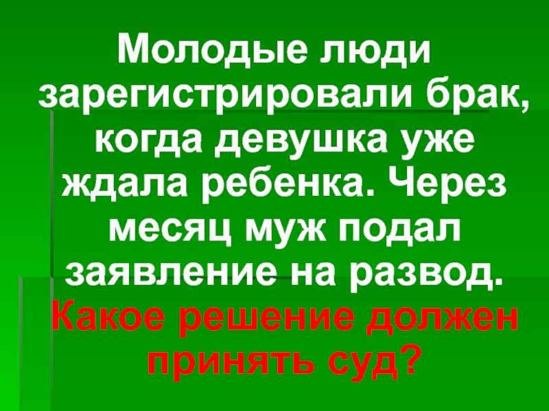 Слайд 20Молодые люди зарегистрировали брак, когда девушка уже ждала ребенка. Через месяц