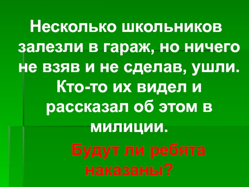 Слайд 14 Несколько школьников залезли в гараж, но ничего не взяв и