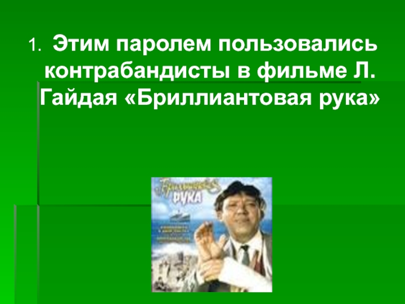 Слайд 331. Этим паролем пользовались контрабандисты в фильме Л. Гайдая «Бриллиантовая рука»