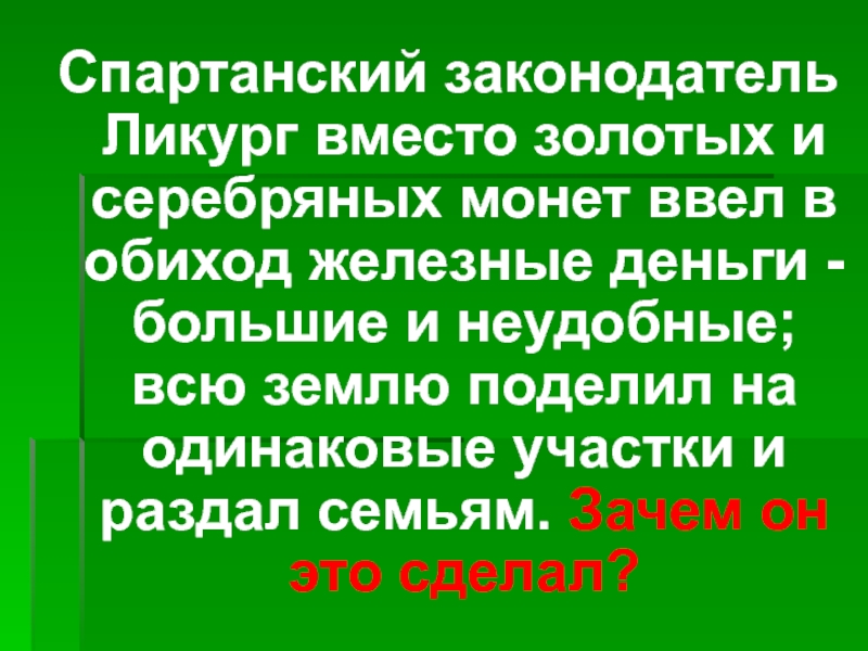 железные деньги - большие и неудобные; всю землю поделил на одинаковые участки и раздал семьям. Зачем он это сделал?