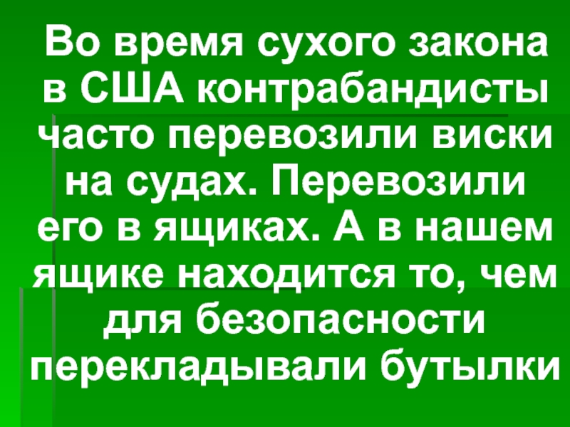Слайд 10 Во время сухого закона в США контрабандисты часто перевозили виски