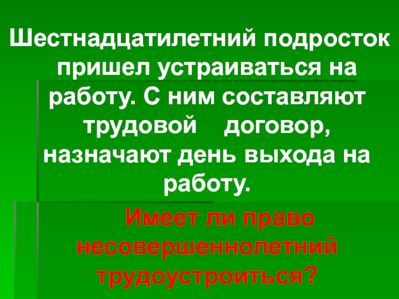 Слайд 18Шестнадцатилетний подросток пришел устраиваться на работу. С ним составляют трудовой