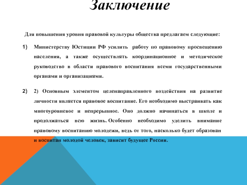 2) Основным элементом целенаправленного воздействия на развитие личности является правовое воспитание. Его необходимо выстраивать как многоуровневое и непрерывное. Оно должно начинаться в школе и продолжаться всю жизнь. Особенно необходимо уделить внимание правовому воспитанию молодежи, ведь от того, насколько будет образован и воспитан молодой человек, зависит будущее России.