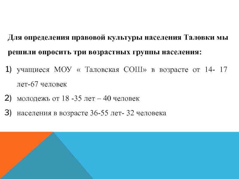 Слайд 11Для определения правовой культуры населения Таловки мы решили опросить три возрастных