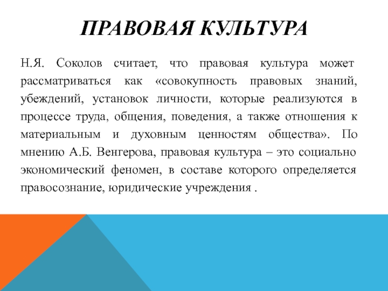Н.Я. Соколов считает, что правовая культура может рассматриваться как «совокупность