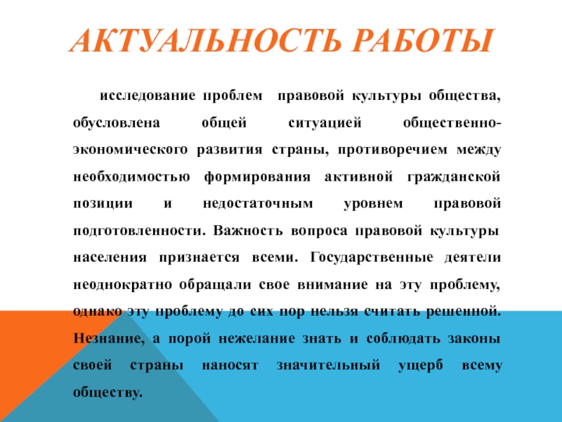 общей ситуацией общественно-экономического развития страны, противоречием между необходимостью формирования активной гражданской позиции и недостаточным уровнем правовой подготовленности. Важность вопроса правовой культуры населения признается всеми. Государственные деятели неоднократно обращали свое внимание на эту проблему, однако эту проблему до сих пор нельзя считать решенной. Незнание, а порой нежелание знать и соблюдать законы своей страны наносят значительный ущерб всему обществу.