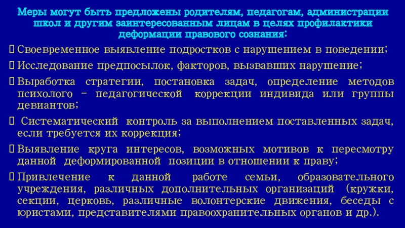 Привлечение к данной работе семьи, образовательного учреждения, различных дополнительных организаций (кружки, секции, церковь, различные волонтерские движения, беседы с юристами, представителями правоохранительных органов и др.).