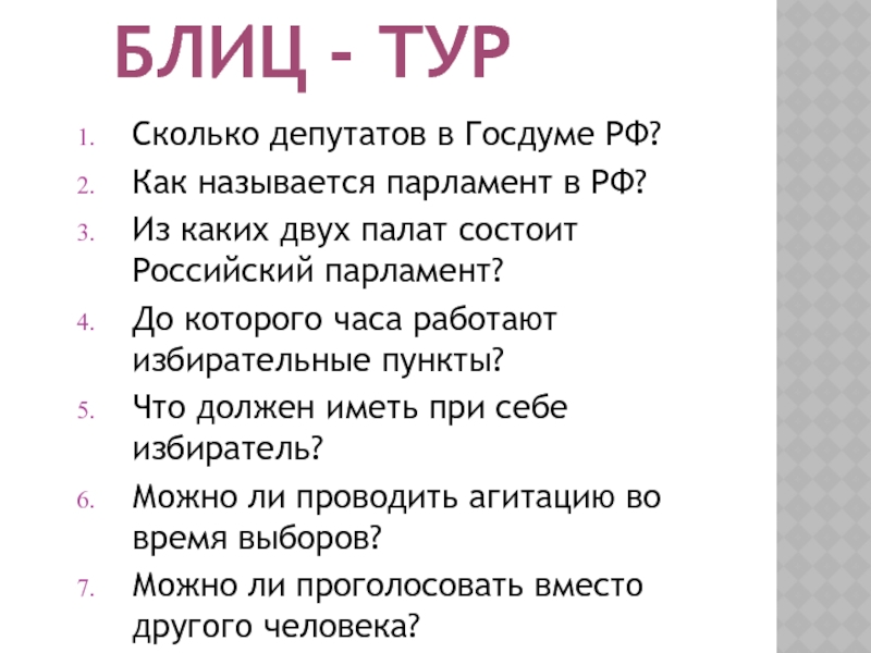 Блиц - турСколько депутатов в Госдуме РФ?Как называется парламент в РФ?Из каких двух палат состоит Российский парламент?До