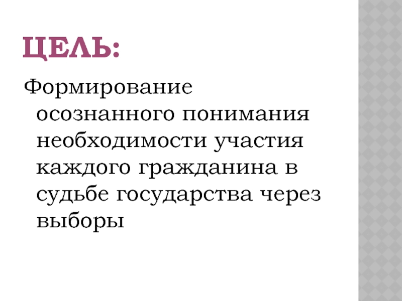 Цель: Формирование осознанного понимания необходимости участия каждого гражданина в судьбе государства через выборы