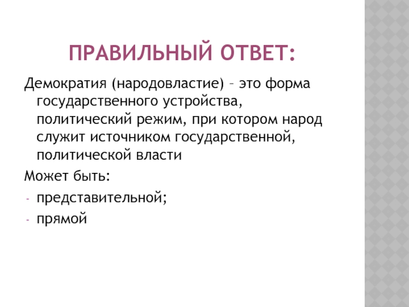 Правильный ответ:Демократия (народовластие) – это форма государственного устройства, политический режим, при котором народ служит источником государственной, политической