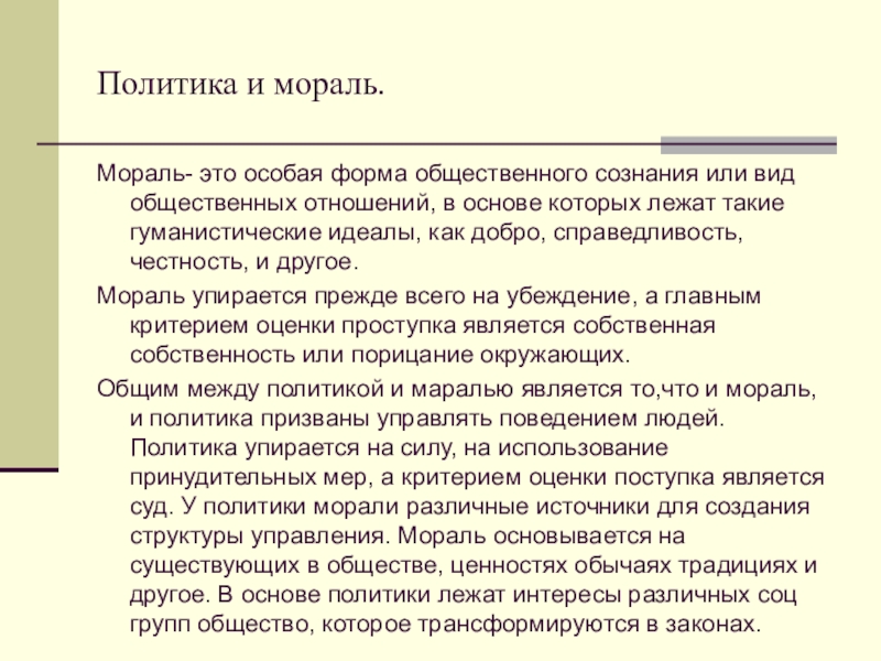 Общим между политикой и маралью является то,что и мораль, и политика призваны управлять поведением людей. Политика упирается на силу, на использование принудительных мер, а критерием оценки поступка является суд. У политики морали различные источники для создания структуры управления. Мораль основывается на существующих в обществе, ценностях обычаях традициях и другое. В основе политики лежат интересы различных соц групп общество, которое трансформируются в законах.