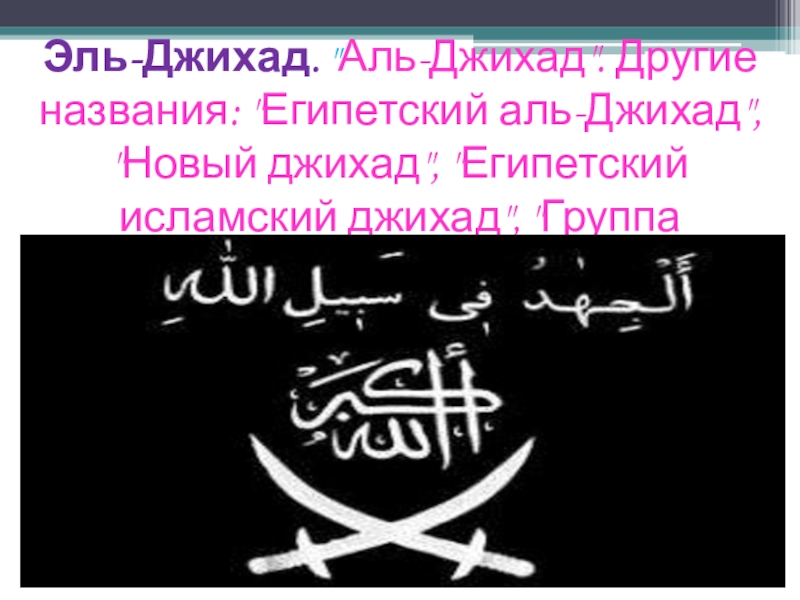 Слайд 16Эль-Джихад. "Аль-Джихад". Другие названия: "Египетский аль-Джихад", "Новый джихад", "Египетский исламский джихад",