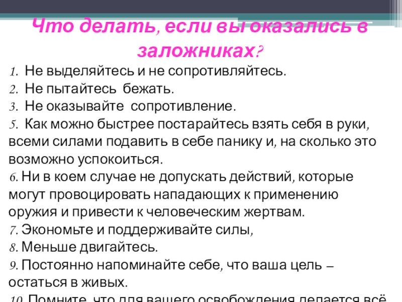 6. Ни в коем случае не допускать действий, которые могут провоцировать нападающих к применению оружия и привести к человеческим жертвам.