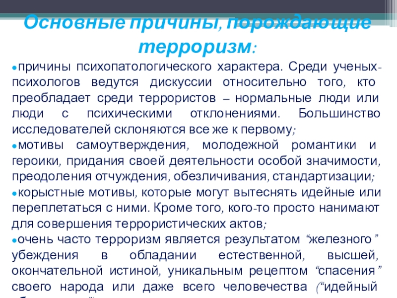 ●очень часто терроризм является результатом “железного” убеждения в обладании естественной, высшей, окончательной истиной, уникальным рецептом “спасения” своего народа или даже всего человечества (“идейный абсолютизм”).