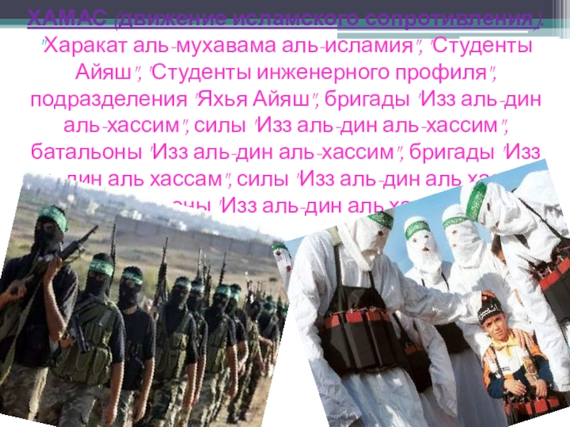Слайд 13ХАМАС (движение исламского сопротивления). "Харакат аль-мухавама аль-исламия", "Студенты Айяш", "Студенты инженерного