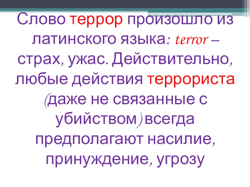 Слайд 6Слово террор произошло из латинского языка: terror – страх, ужас. Действительно,
