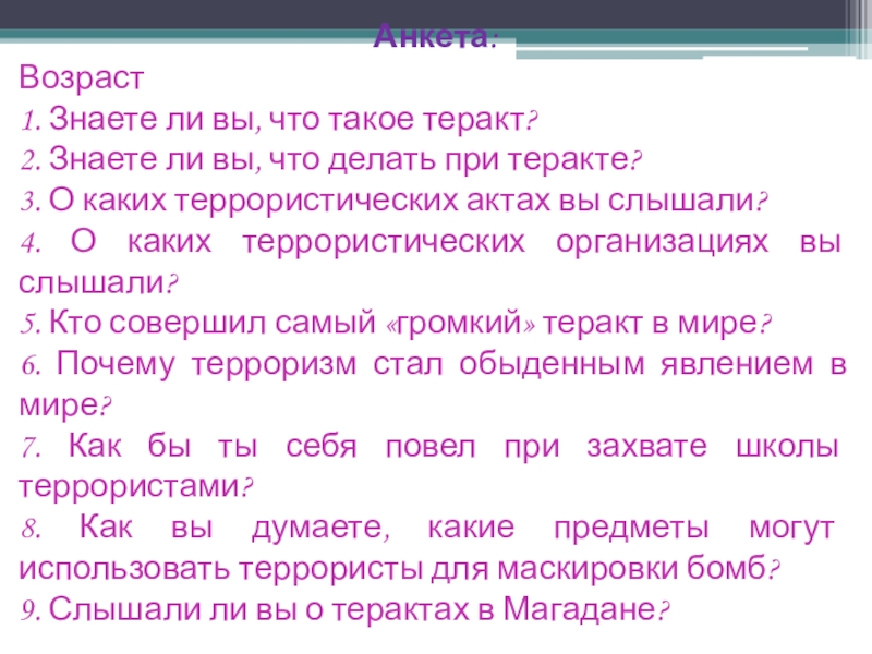 того, кто преобладает среди террористов – нормальные люди или люди с психическими отклонениями. Большинство исследователей склоняются все же к первому;