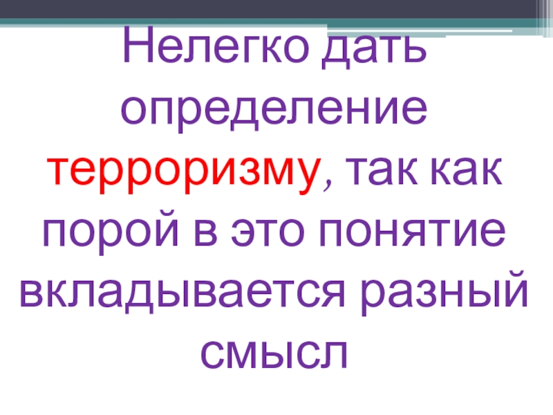 Слайд 4Нелегко дать определение терроризму, так как порой в это понятие вкладывается