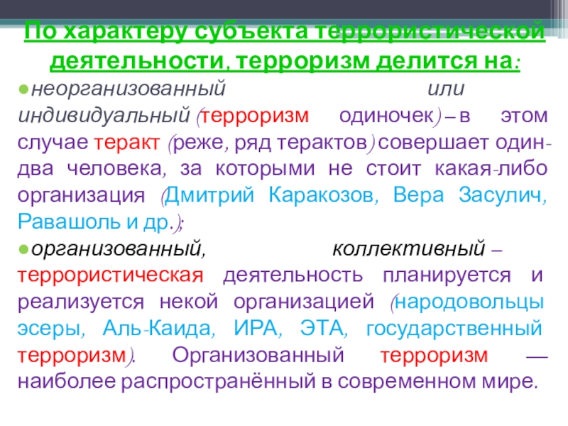 ●организованный, коллективный – террористическая деятельность планируется и реализуется некой организацией (народовольцы эсеры, Аль-Каида, ИРА, ЭТА, государственный терроризм). Организованный терроризм — наиболее распространённый в современном мире.