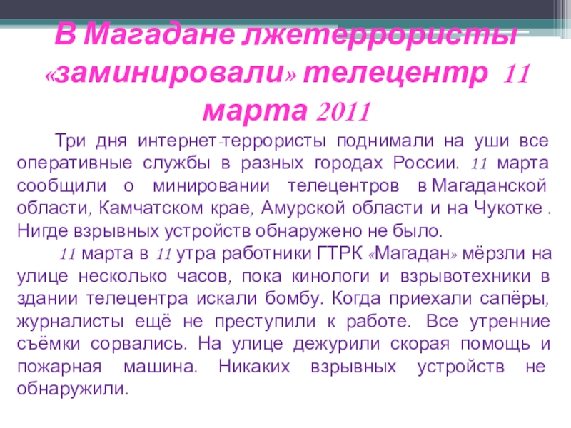 Слайд 24В Магадане лжетеррористы «заминировали» телецентр 11 марта 2011