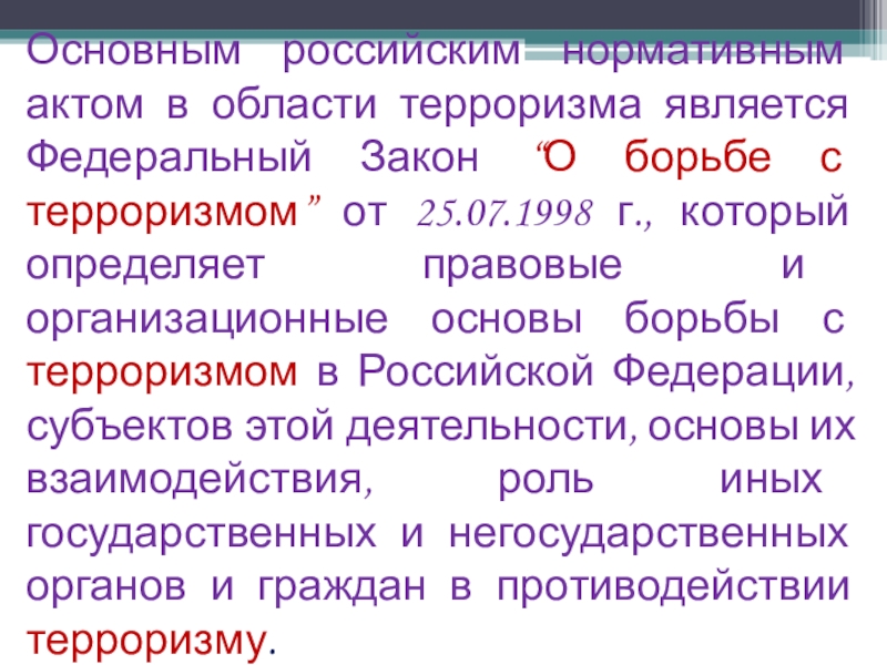 борьбе с терроризмом” от 25.07.1998 г., который определяет правовые и организационные основы борьбы с терроризмом в Российской Федерации, субъектов этой деятельности, основы их взаимодействия, роль иных государственных и негосударственных органов и граждан в противодействии терроризму.
