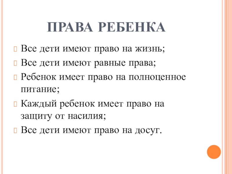 ПРАВА РЕБЕНКАВсе дети имеют право на жизнь;Все дети имеют равные права;Ребенок имеет право на полноценное питание;Каждый ребенок