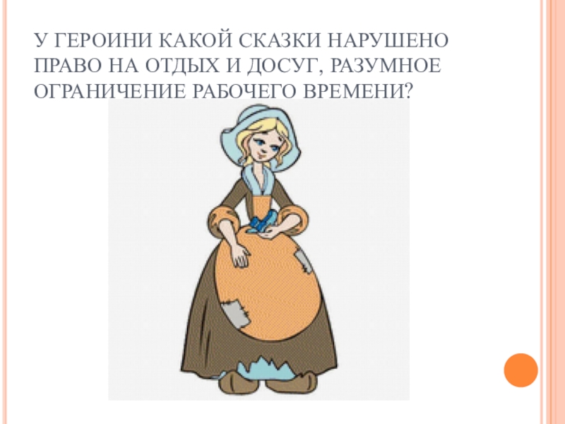 Слайд 5У ГЕРОИНИ КАКОЙ СКАЗКИ НАРУШЕНО ПРАВО НА ОТДЫХ И ДОСУГ, РАЗУМНОЕ