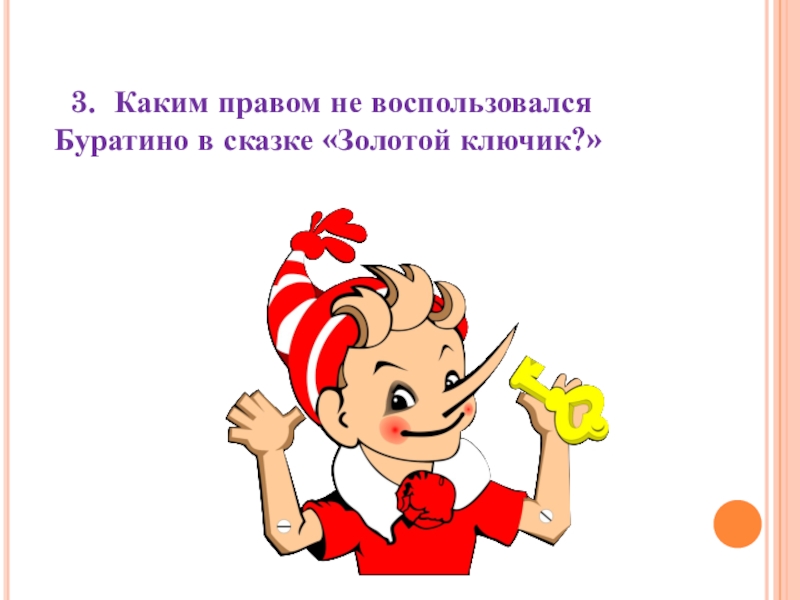 Слайд 13 3. Каким правом не воспользовался Буратино в сказке «Золотой ключик?»