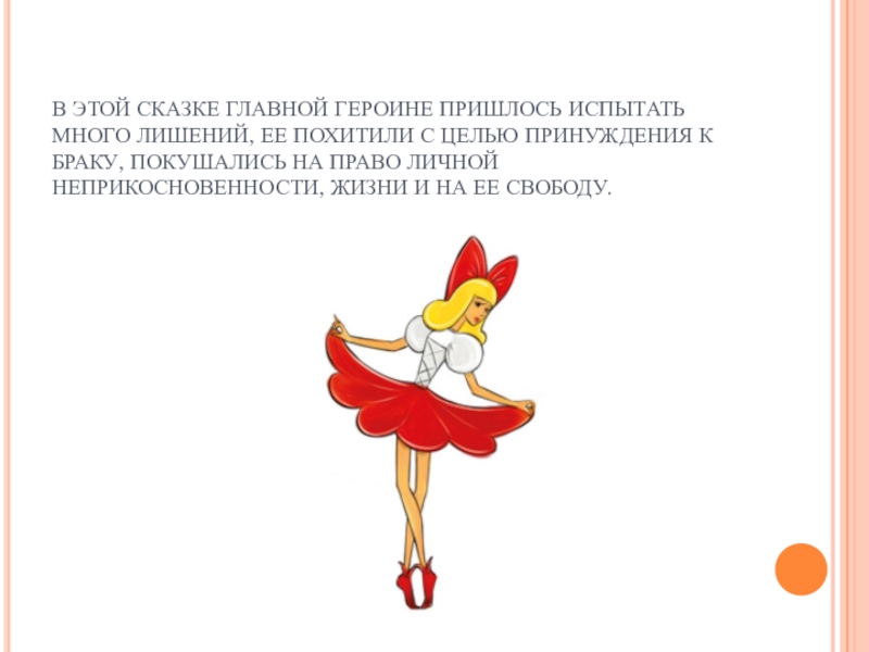 Слайд 6В ЭТОЙ СКАЗКЕ ГЛАВНОЙ ГЕРОИНЕ ПРИШЛОСЬ ИСПЫТАТЬ МНОГО ЛИШЕНИЙ, ЕЕ ПОХИТИЛИ