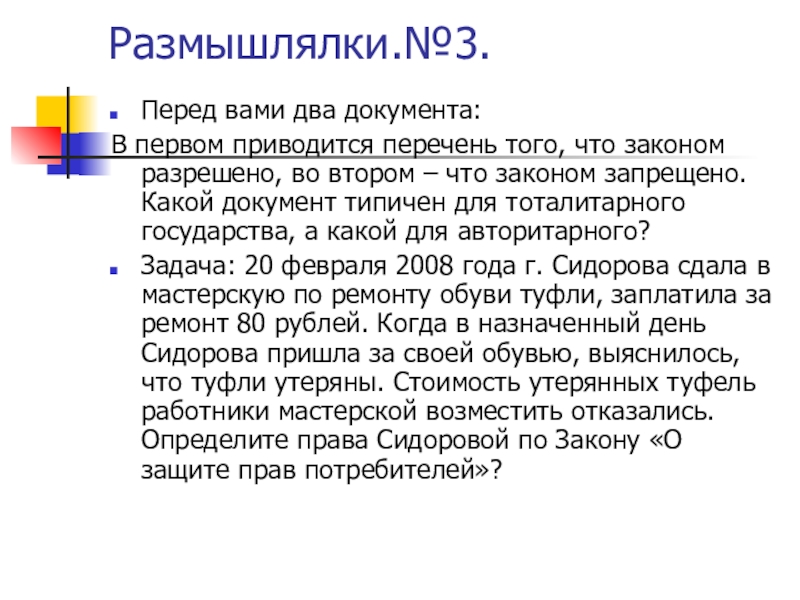 во втором – что законом запрещено. Какой документ типичен для тоталитарного государства, а какой для авторитарного?