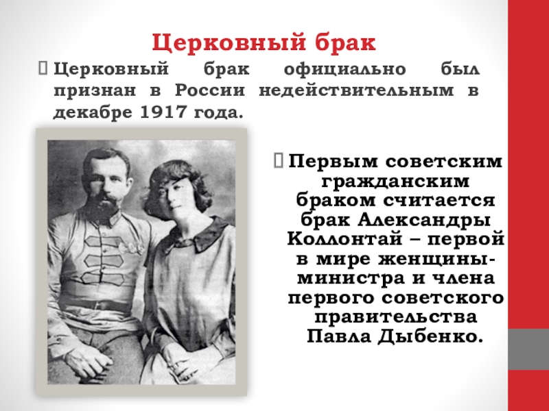 Первым советским гражданским браком считается брак Александры Коллонтай – первой в мире женщины-министра и члена первого советского правительства Павла Дыбенко.