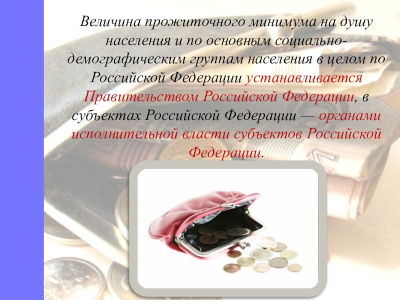 населения в целом по Российской Федерации устанавливается Правительством Российской Федерации, в субъектах Российской Федерации — органами исполнительной власти субъектов Российской Федерации.