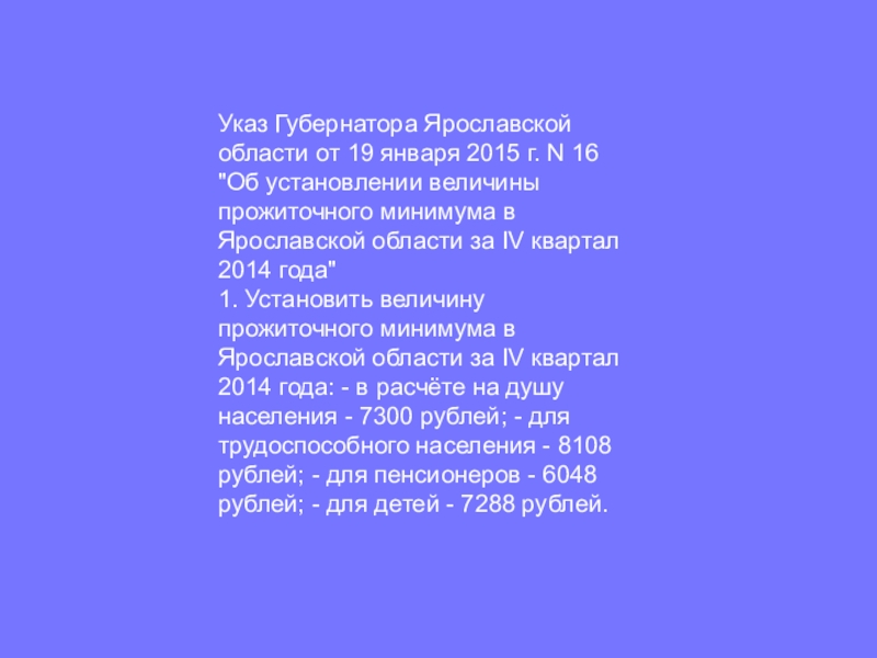 1. Установить величину прожиточного минимума в Ярославской области за IV квартал 2014 года: - в расчёте на душу населения - 7300 рублей; - для трудоспособного населения - 8108 рублей; - для пенсионеров - 6048 рублей; - для детей - 7288 рублей.