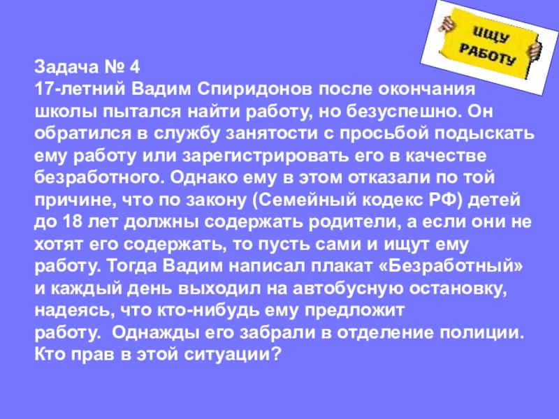 но безуспешно. Он обратился в службу занятости с просьбой подыскать ему работу или зарегистрировать его в качестве безработного. Однако ему в этом отказали по той причине, что по закону (Семейный кодекс РФ) детей до 18 лет должны содержать родители, а если они не хотят его содержать, то пусть сами и ищут ему работу. Тогда Вадим написал плакат «Безработный» и каждый день выходил на автобусную остановку, надеясь, что кто-нибудь ему предложит работу. Однажды его забрали в отделение полиции. Кто прав в этой ситуации?