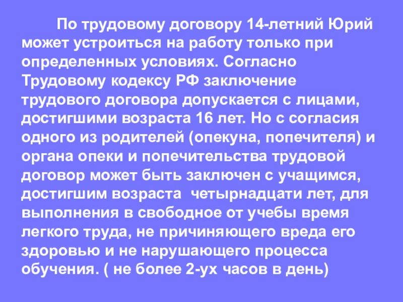 Слайд 43 По трудовому договору 14-летний Юрий может устроиться на работу только при