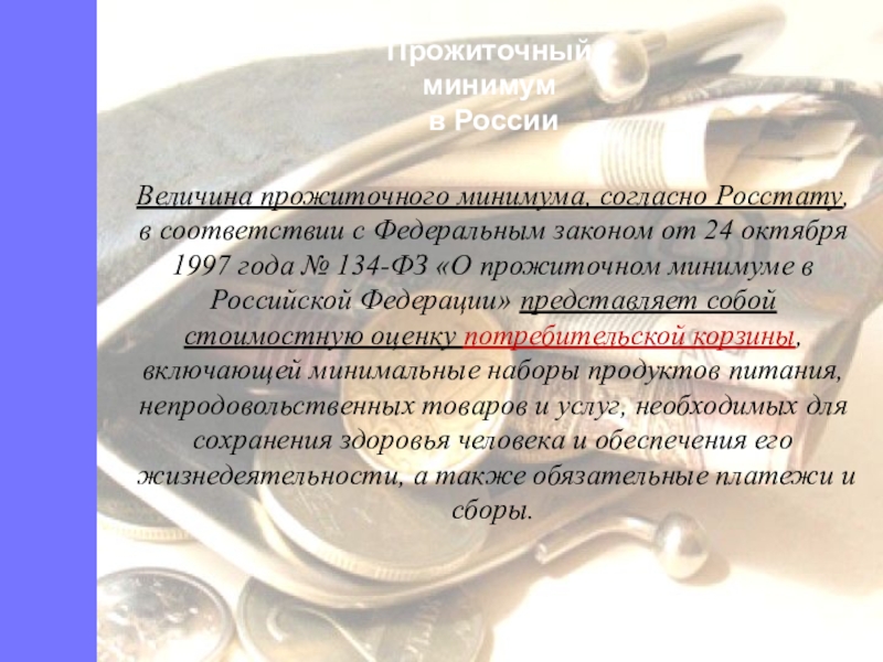 законом от 24 октября 1997 года № 134-ФЗ «О прожиточном минимуме в Российской Федерации» представляет собой стоимостную оценку потребительской корзины, включающей минимальные наборы продуктов питания, непродовольственных товаров и услуг, необходимых для сохранения здоровья человека и обеспечения его жизнедеятельности, а также обязательные платежи и сборы.