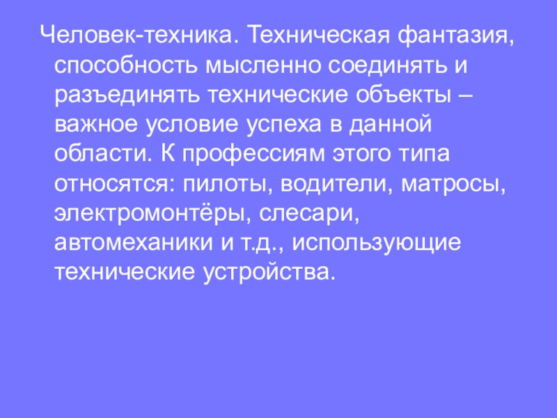 – важное условие успеха в данной области. К профессиям этого типа относятся: пилоты, водители, матросы, электромонтёры, слесари, автомеханики и т.д., использующие технические устройства.